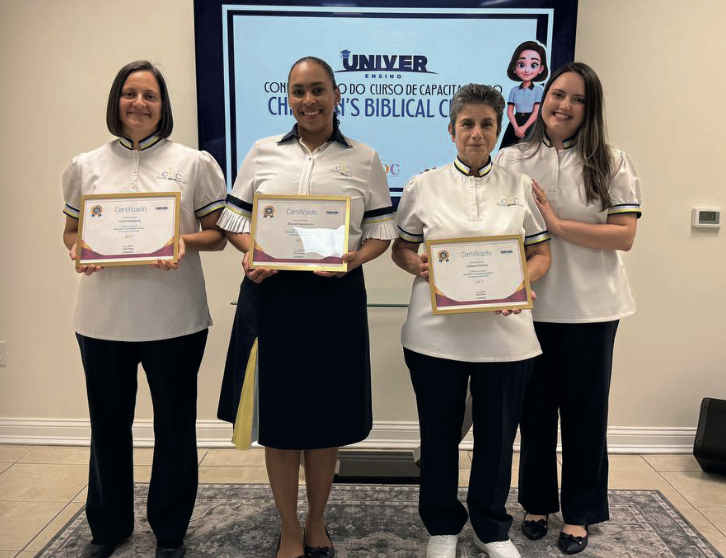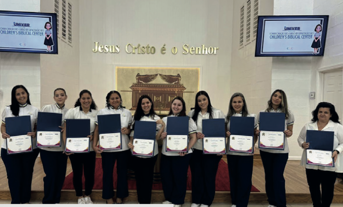 Ela se prepara, pede direção a Deus e medita no tema da semana. Com amor, elabora o recurso que será apresentado. Todos os detalhes são pensados com carinho para receber cada criança que entra na sala da CBC. As voluntárias do Children’s Biblical Center (CBC) ensinam valores cristãos de forma lúdica, por meio de histórias, músicas e atividades. Elas se dedicam a transmitir os princípios bíblicos e a importância da fé, realizando seu trabalho com excelência. Assim é a voluntária da CBC. No último domingo, as voluntárias foram consagradas e condecoradas, recebendo seus certificados de conclusão do curso e, juntamente com eles, a bênção e a direção de Deus nesta missão de instruir as crianças na Palavra e levá- las a conhecer o Senhor Jesus. A condecoração foi referente ao curso de capacitação promovido pelo Univer Ensino, voltado para voluntárias da CBC. O curso ensina técnicas para transmitir a Palavra de Deus de forma atrativa às crianças e inclui módulos específicos, como o de educação inclusiva para crianças atípicas. Responsável pelo trabalho da CBC na língua portuguesa no país, Simony Gomes, relatou a importância dessa formação: “Fiquei muito feliz em participar do curso do Univer Ensino voltado para as voluntárias. Foi uma experiência enriquecedora, tanto no lado prático quanto no espiritual. Aprendemos que cuidar das crianças vai muito além de apenas estar com elas — é servir a Deus com excelência, transmitindo amor, paciência e a Sua Palavra. Cada momento do curso nos ajudou a crescer e a entender ainda mais a importância do nosso chamado: formar as crianças para o Reino de Deus.” Assim como Simony, Júlia Nascimento, voluntária no estado de Everett–MA, também compartilhou sua experiência: “Eu amei fazer o curso! Me ensinou muito como educadora. Amei as partes em que explica as diferenças de idade e como cada fase aprende. Isso nos ajuda muito a transmitir a Palavra da forma certa para cada etapa da criança. Foi muito aprendizado!” Voluntárias de todo o país expressaram o quanto o curso foi gratificante e enriquecedor, fazendo diferença nas salas da CBC. Ana Luiza, de Goose Creek– SC, destacou: “O curso das voluntárias foi uma grande bênção! Ele ensina muito bem como cuidar das crianças, como atender os pais e responsáveis e também como lidar com diferentes situações na CBC. Além disso, aprendemos a levar a Palavra de Deus de forma especial para cada faixa etária, com amor, sabedoria e dedicação. Foi um tempo de muito aprendizado e crescimento espiritual.”
